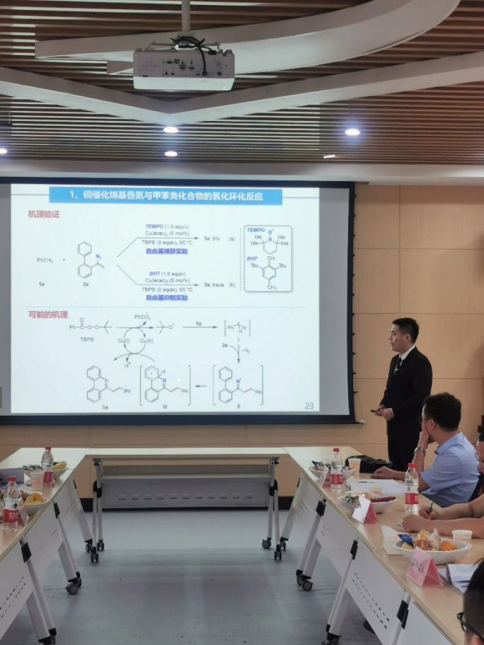 答辩会议严格按照我校研究生学位论文答辩程序有序进行。答辩开始后,委员会认真听取了博士学位申请人杨均成题为“亚胺自由基参与的分子内环化反应及烷氧自由基参与的开环/硼化反应研究”的答辩陈述。随后,针对其答辩过程中所显示的问题及毕业论文中的细节,答辩委员们依次进行了细致提问。例如,针对课题一中产率偏低的问题,郭武生教授提出温度变化可能对产率影响很大,并用本课题组的实例让在座师生有更加真切的体会。杨俊教授针对氧化还原活性酯和环烷基过氧硅醚的相关性质进行了提问,答辩人尽自己所能对各问题进行细致解答,充分体现了其攻读博士期间在相关领域的积累和沉淀。何炜教授不仅针对论文中测定量子产率的具体原理和步骤提出了问题,还对毕业论文中的诸多细节提出了改进意见,使答辩人受益良多。徐四龙教授针对答辩人所研究的自由基领域中关于自由基选择性、种类等原理问题进行了提问,并对反应机理中的具体步骤提出了新的见解,十分引人深思。最后,答辩主席李鹏飞教授对答辩人的毕业论文进行了整体点评,并对以后反应设计等问题提出了中肯建议。
