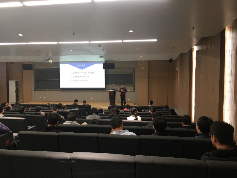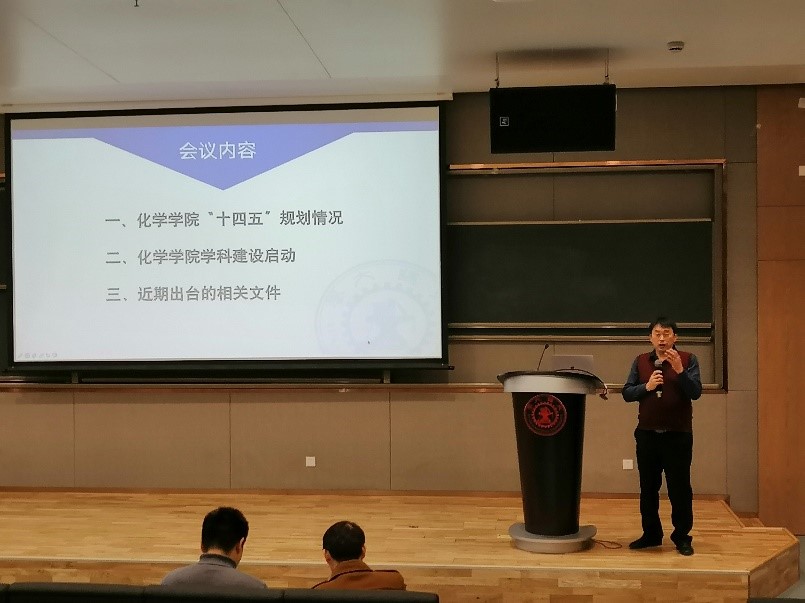 随后他介绍了近年来学科建设的相关情况。通过学校不断支持,尤其是创新港化学研究院的启用,化学学科建设工作大步前进。同时,学院通过不断改革创新,利用国家破除了五唯的等理念,将科学研究贯穿到祖国发展,持续聚焦行业痛点,不断深化将论文写在祖国大地上。随后,丁书江从师资队伍、资源和科学研究水平以及社会服务等方面对学科建设进行了分析并提出相关要求。