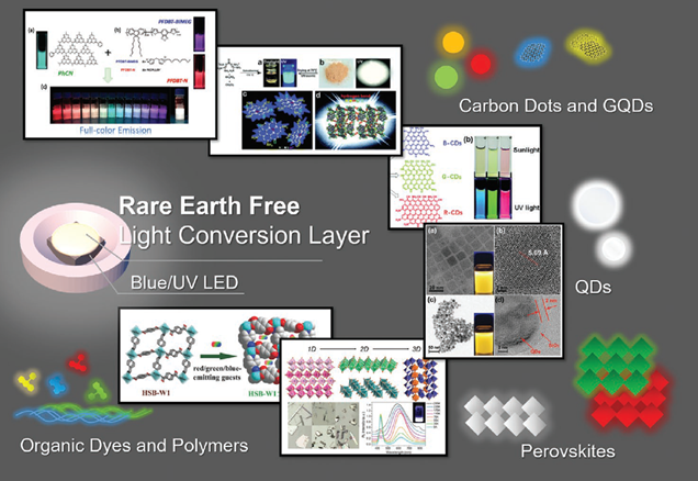 白光二极管(WLED)照明技术的发展和应用对降低能耗具有重要意义。目前商用的、常用的白光LED器件的制备离不开稀土元素的使用。然而,稀土元素是不可再生的资源,采矿和精炼过程对环境有不利影响。近年来,研究人员已经开发出了多种不含稀土元素的新的白色发光材料,如量子点、荧光碳点、钙钛矿材料、有机发光材料和金属有机框架材料等,其中一些已成功应用于白光LED的研制中。