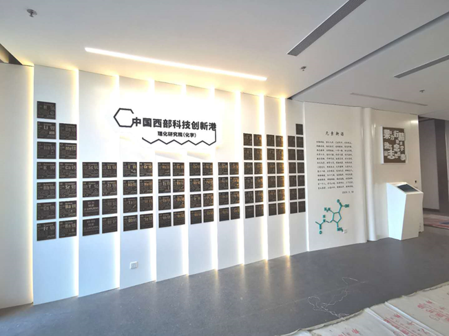 在文化元素的具象化方面,学院着力突出化学学科的特有化学元素和特征,并在此基础上凝练出文化意象,同时融合平面设计、交互式新媒体等表达手段,坚持艺术性与实用性的有机统一,从而实现综合式教学科研空间全方位、立体化和实时性呈现。其中,在化学研究院一层正东走廊,设计“学科分析测试平台”走廊区域,悬挂介绍展板并设置液晶显示屏,介绍各台(套)仪器的功能、使用规范,显示设备3D影像、设备预约情况。在二层正东走廊两侧悬挂研究概况展板,介绍各科研平台及研究所的研究方向、研究成果和相关成员信息。在二到五层正东走廊中部放置交互式电子屏,滚动播出各研究所相关方向科研进展和成果等科研动态。在四层还设计建设了校企合作展示区,基于学院办学理念、育人模式、产教融合、成果转化、企业文化等方面对校企合作进行综合展示。同时,在五层也建设了多功能教工之家,布置风格温馨的教工风采展示区作为党务、会议、培训等工作的开展场所。在各楼层的公共区域放置了沙发、跑步机、乒乓球台等休闲、锻炼设施,供师生工作间隙放松身心,营造轻松愉快、团结合作的工作氛围。