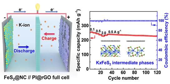 针对上述问题,437必赢会员中心高国新副教授、丁书江教授与剑桥大学石墨烯中心郗凯博士合作,采用一种新颖的“吹泡泡”法制备出氮掺杂碳包覆的铁基硫属族化合物二维纳米复合材料(FeS2@NC),表现出优异的钾离子电池性能和应用前景。在0.1 A/g电流密度下进行钾离子半电池充放电测试,可逆比容量达到525.5 mAh/g;在10 A/g的高电流密度下的可逆比容量仍有154.7 mAh/g,循环寿命长达5000圈。与正极匹配后的钾离子全电池经120次循环后,容量保持率超过88%,库仑效率超过99.9%。密度泛函数(DFT)计算表明,硫化铁(FeS2)比硒化铁(FeSe2)表面更有利于钾离子的吸附和扩散,嵌钾中间相对钾离子吸附更强;氮掺杂碳包覆层进一步增强了电极材料和钾离子的相互作用。本工作提出的高性能电极材料设计思想和电化学反应机理研究为开发可实用化高性能电极提供了借鉴。