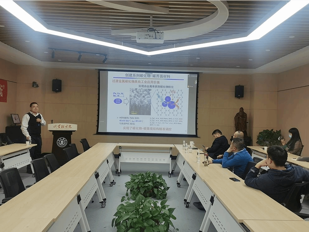 报告会上,范修军教授重点围绕“如何在原子—分子水平对电催化剂表面结构进行精准调控,提高单位催化活性位的本征活性”这一科学问题,提出了铁族金属纳米多孔薄膜的低温合成策略,初步建立了缺陷、表面电荷、晶面取向与电催化性能间的构效关系,实现了不同金属碳化物纳米晶的低温可控制备,发展了过渡金属碳化物复合电催化剂。该系列 CVD 催化材料将为进一步发展高活性、非贵金属电催化材料体系提供理论和实践上的依据。最后,范修军教授指出我国电催化制备清洁能源的转化技术仍然处于起步和发展阶段,同时鼓励广大师生要坚持不懈攻关,坚定走产学研合作之路,早日突破技术瓶颈。