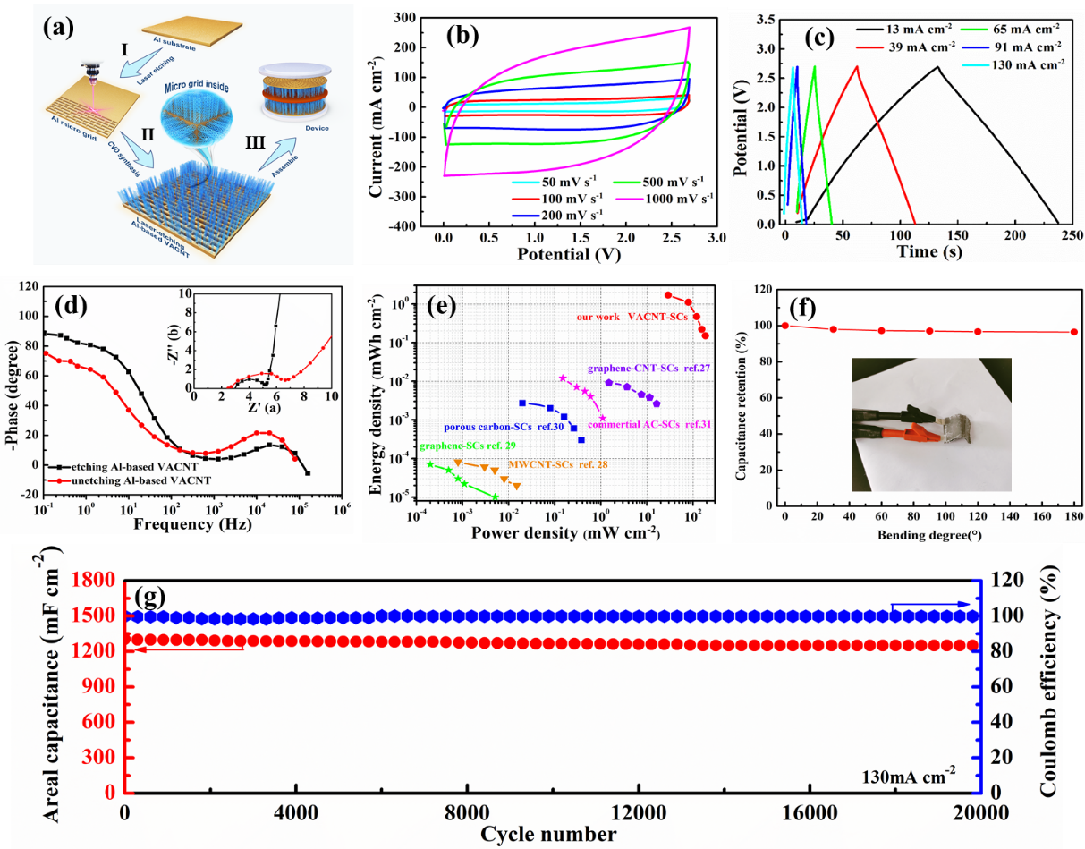 针对这一问题,437必赢会员中心杜显锋教授团队采用激光刻蚀技术结合化学气相沉积法设计并制备了一种具有多级结构的铝微栅阵列碳纳米管(VACNTs)电极,与通过传统涂布方法制备的CNTs电极相比,Al微栅VACNTs电极具有更高的活性材料负载量(13 mg cm-2)、与集流体之间结合较好,并且表现出优异的电化学性能。当电流密度为13 mA cm-2时,电极的面容量高达1,300 mF cm-2;而且在高电流密度下(130 mA cm-2)循环20,000圈后容量保持率为90%以上。此外,由于集流体与活性材料之间具有良好的机械强度和柔韧性,在多次多角度弯曲后仍然表现出良好的性能。该项研究结果表明具有多级结构的Al微栅VACNTs电极在高性能、柔性和可穿戴超级电容器储能器件领域具有良好的应用潜力。