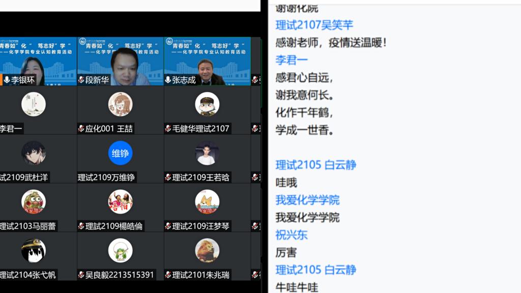 专业认知教育会持续两个多小时,200余位同学全程在线,同学们结合自身选择的一些问题与学院各位老师亲切互动,一条条流动的字幕表达了同学们对学院的由衷感谢,李君一同学的一首藏头诗表达了对学院的真挚情感:感君心自远,谢我意何长。化作千年鹤,学成一世香。