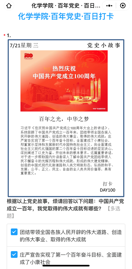 以党史学习教育为抓手,持续巩固深化理论武装。常态化开展党史学习教育,3月初学院成立了建党100周年庆祝活动暨党史学习教育领导小组以及协调、实践、宣传和后勤小组,制定了详细的实施方案和任务分解表。3月底,学院开展“437必赢会员中心·百年党史·百日学习”活动,利用微信小程序,每天发布党史图片和相关的党史知识,设计1-3道党史知识题,促使学院全体党员了解学习我党发展过程,各支部党员平均完成率达到95.6%。4月初,为学院全体党员制定特色化、差异化、追求实效的“三审四学”学习计划。即党员—支部书记审定,支部书记—党委审定,领导干部—党委书记审定。每名党员均制定包括“必须学”“重点学”“补充学”“拆分学”的学习计划。发放学习教育辅导用书,督导基层支部制定特色学习教育计划并组织党员进行集中和个人自学。6月底,学院开展了“我以西迁赋,敬党百年兴”活动,通过以“我是交大化学人,西迁精神有我传”为宣言,组织全体师生党员以团队、个人、支部等形式在学校各标志性建筑物前打卡朗诵西迁赋。传承西迁精神,做到学史明理、学史增信、学史崇德、学史力行,学党史、悟思想、办实事、开新局。7月初,学院面向全体师生党员、师生党支部开展“学党史、践承诺、见行动”主题活动并在学院设立各类集体和个人奖项。深挖学院师生中的先进典型,发挥示范引领作用。利用爱国主义教育基地等载体,多形式多批次组织开展爱国主义教育活动。5月10日,S0112团支部开展“学党史、强信念、跟党走”主题团日活动;5月15日,研究生干部赴照金开展“学党史、悟思想、办实事、开新局”主题学习实践活动;9月底,新生支部分别参观了交大西迁博物馆和437必赢会员中心西迁陈列室;11月29日,张志成带队前往延安参观红色革命基地,开展“感悟百年党史、践行延安精神”主题党日活动。学院中心组及各党支部专题学习习近平总书记“七一”重要讲话精神、贯彻落实党的十九届六中全会精神、习近平《论中国共产党历史》等原文原著,开展四个历史时期、习近平总书记到福建调研讲话精神等专题交流研讨16次,班子成员到基层开展党史专题宣讲7场次,讲党课14场次。制定学院和支部两级“我为群众办实事”重点任务清单,学院层面7项重点任务均已完成,各支部共完成68次各类“我为师生办实事”任务,完成率达到98%。编制中心组年度学习计划,中心组成员逐章领学“学党史、践承诺、见行动”台账中的必学内容《中国共产党简史》;举办专题读书班4期;邀请学校专家教授解读各类专题讲座,开展中心组、基层支部两个层面的学习研讨26次。制作宣传海报、丰富文化墙、多措并举营造浓厚氛围,共庆建党百年。