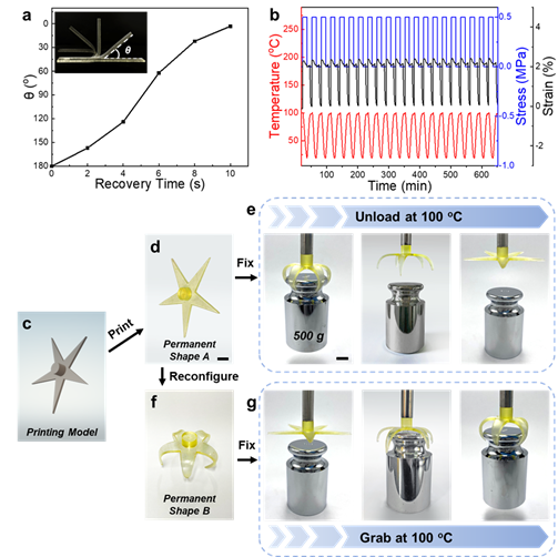 4DP-PTU中高交联密度网络赋予材料在形状记忆过程中的高形状固定率(97.1%)、高形状恢复率(98.2%)、快速形状恢复(<10秒)。经过20次连续的循环形状记忆过程后,未出现残余变形,证明其良好的耐久性与热稳定性。4DP-PTU中的动态硫代氨酯键赋予其永久形状重构的能力,经过重构,4DP-PTU抓手可以同时实现对重达500 g的砝码的抓取与释放,解决了已有4D打印技术难以同时实现抓取与释放的问题,有望应用于机器人领域。