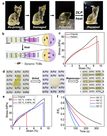 相较于传统光固化3D打印树脂,4DP-PTU由于动态硫代氨酯键而具有优异的自修复性、重塑性。4DP-PTU打印结构在发生损坏后可通过“断面再打印”的方式进行修复,性能恢复如初。并且可以对4DP-PTU粉末通过简单的热压处理,实现自愈合与从粉末到块体材料的重塑,且自愈合或重塑后依然保持与原块状材料相同的机械性能。