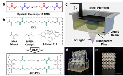 首先,2,2′-(1,2-乙二基双氧代)双乙硫醇(EDDET)和甲基丙烯酸异氰基乙酯(IEM)通过点击化学合成动态交联剂(DCL);随后,DCL与活性稀释剂甲基丙烯酸甲酯(MMA)混合得到打印墨水。通过DLP打印得到分辨率高、表面光滑的聚硫氨酯(4DP-PTU)结构。