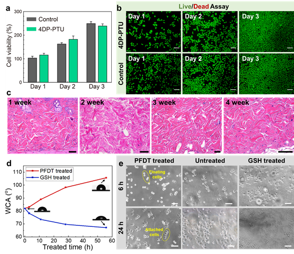 图5. 4DP-PTU的生物相容性和其表面改性。