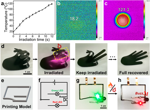 4DP-PTU中加入碳纳米管制备得到复合材料4DP-PTU/CNT,可实现近红外光(NIR)触发的精确区域化形状控制。在近红外激光的辐射下,4DP-PTU/CNT发生光热转化,表面温度在12秒内从室温上升到超过120 oC。用4DP-PTU/CNT打印的手掌形状可按需变形证明了光控形状记忆的精确性。基于热和光的双重响应性,由4DP-PTU/CNT制备的报警器,可在发生异常高温与红外光暴露时报警,证明了其在智能警报器方面的潜在应用。