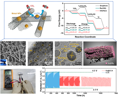 近期,该团队采用密度泛函理论(DFT)揭示了钌/碳复合催化剂与CRR和CER催化过程的构效关系。结果表明,相比于钌和碳位点,钌/碳界面(Ru/C)表现出更有利的电子结构,可以显著降低CRR和CER过程关键中间体的反应势垒。基于此,作者设计合成了一种具有丰富Ru/C界面的三维自支撑纤维素负载钌碳气凝胶(Ru@CCA),并将其成功应用于Li-CO2电池。得益于Ru/C界面优异的催化活性、CCA快的电荷、反应物传输速度及其广阔的产物沉积空间,Ru@CCA基Li-CO2电池能量效率高达80%、放电面容量达10.71 mAh cm-2、在100 μA cm-2电流密度下循环寿命长达421圈。同时,为了进一步证明金属/碳界面在改善CRR和CER反应动力学的普适性,作者又合成了一系列纤维素负载过渡金属/碳(Fe/C,Co/C,Ni/C)气凝胶,并将其应用于Li-CO2电池。结果表明,这些过渡金属/碳界面也可以显著提升Li-CO2电池的电化学性能。此外,作为概念验证实验,作者组装了Ru@CCA基柔性Li-CO2电池。实验结果表明,得益于CCA优异的机械性能,CCA基Li-CO2电池在柔性可穿戴器件中表现出巨大的应用潜力。相关工作以《Rational Design of Nanostructured Metal/C Interface in 3D Self-supporting Cellulose Carbon Aerogel Facilitating High-Performance Li-CO2 Batteries.》为题发表在国际知名期刊《Advanced Energy Materials》上,437必赢会员中心博士生刘理民为本文第一作者。