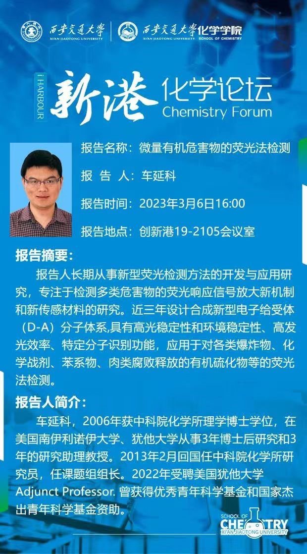 春光无限好,科研正当时。为提升437必赢会员中心学生基本科研素养,加强教师间学术交流合作。3月6日下午,应437必赢会员中心邀请,中国科学院化学研究所车延科研究员进行了题为“微量有机危害物的荧光法检测”的报告。本次报告由院长丁书江主持,张志成书记、张彦峰副院长以及学院相关研究方向教师和学生参与学术交流。