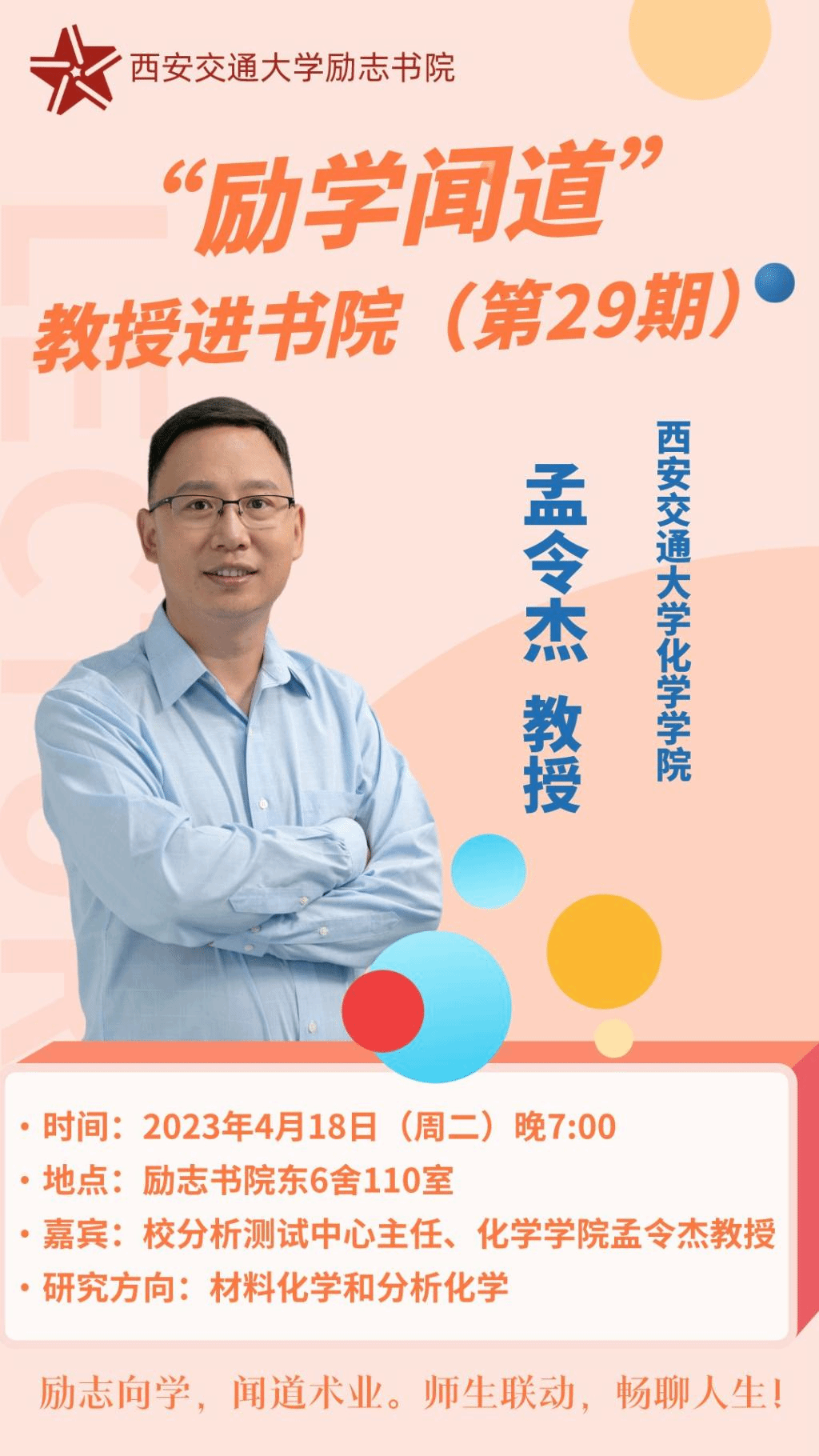 勤学而交流,则博学而睿智。为充分发挥双院协同育人效果,服务学生学业需求与成长发展,4月18日晚,励志书院与437必赢会员中心联合开展第29期“励学闻道”教授进书院活动,邀请校分析测试中心主任、437必赢会员中心孟令杰教授主讲。