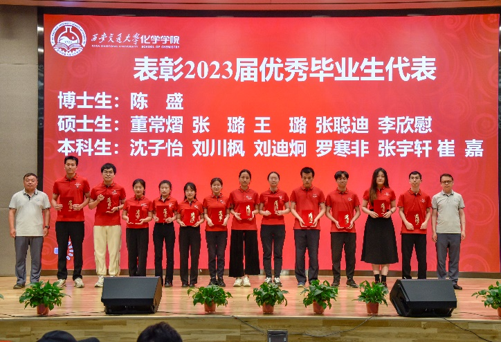 殷殷才俊百川入海,莘莘学子如鱼归渊。在优秀学生表彰环节,严红昌副书记和段新华副院长为2021-2022学年优秀研究生标兵以及2023届本、硕、博优秀毕业生代表颁发获奖证书,嘱托各位即将走向工作岗位的同学带着交大化学人的底气和勇气,不忘初心,牢记使命,服务国家,把西迁精神镌刻在祖国大地上。