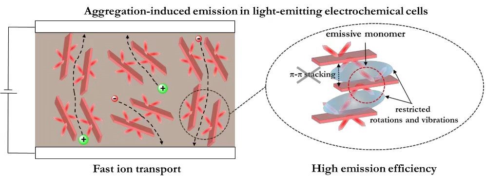 发光电化学电池(LECs)是一种具有低成本、可柔性制备的光电显示器件,其中,LECs中的电化学掺杂过程与其活化层形貌和离子分配等密切相关。为了深入研究该过程,437必赢会员中心党东锋教授联合瑞典于默奥大学物理系LudvigEdman教授,查尔姆斯理工大学Ergang Wang教授等在基于聚集诱导发光分子的发光电化学电池方面取得了新进展。研究表明,在LEC工作时,AIE材料及其薄膜形貌更有利于离子传输,并且能够很好地抑制激子的非辐射失活,进而取得优异的器件性能。相比于ACQ-LEC,AIE-LEC表现出了更快的开启速度,高效且稳定的发光性能。该研究证明了AIE-LEC可能是实现快速、高效发光器件的有效途径,并提供了一种低成本和可持续发展的器件制备方法。相关研究成果以《基于分子设计的聚集诱导发光:一种制备高性能电化学电池器件的新策略》(Aggregation-Induced Emission by Molecular Design: A Route to High-Performance Light-Emitting Electrochemical Cells)为题发表在德国《应用化学》(Angewandte Chemie International Edition)上(Angew. Chem. Int. Ed. 2023, 62, e202302874)。