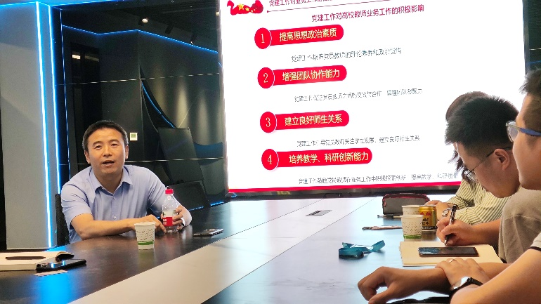 张志成书记首先明确指出当前党建工作与中心工作衔接不够,要求师生在开展业务工作的同时,充分发挥党建工作的引领和推动作用,实现党建工作与业务工作的深度融合,相互促进、良性互动。针对党支部教师所提出的现阶段科研和教学过程中教师和学生之间的关系处理问题,张志成书记以独特的视角、生动的形式分享了四点“师生之道”。
