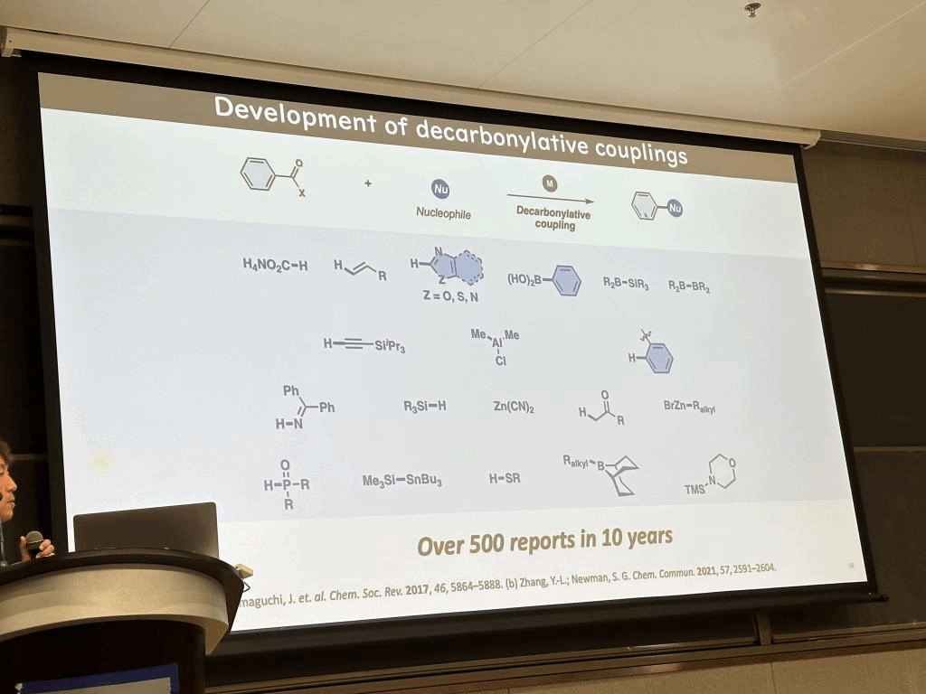 芳香基化合物是在化学工业中起着基础作用的基本化学品,从我们日常生活中熟悉的化学产品到药品和有机电子材料,它一直贯穿其中。Yamaguchi教授的报告语言风格幽默风趣,详尽、系统地展示了课题组在芳香羰基化合物的新型科研成果及非常规转化反应的开发进展。