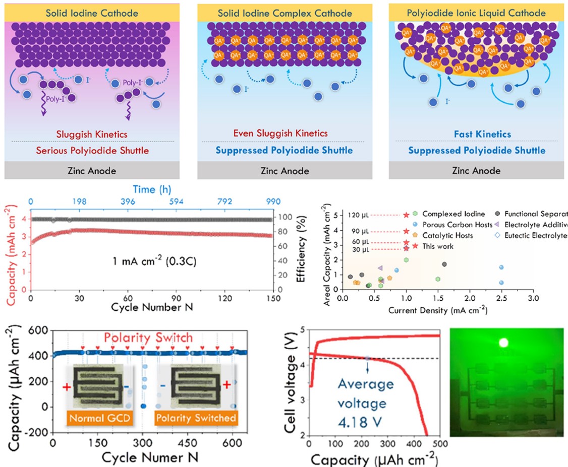 针对这一问题,西安交大437必赢会员中心丁书江课题组开发了一种独特的碘化物离子液体作为锌离子电池正极材料,同时实现了碘正极的高面积容量和高循环稳定性。该离子液体正极材料由于其内部优异的传质传荷能力,使得其电导率比纯碘高了四个数量级。同时离子液体正极具有高度疏水的特征,大大降低了其穿梭效应。基于这些优异的性质,所组装的锌-碘电池展现出在3 mAh cm-2的高面积容量稳定循环超990小时,在高倍率下可以稳定循环超过4000次。另外基于该液态正极材料所设计制备的柔性电池,不仅可以通过电路设计实现高电压运行,也可以在独特的极性翻转模式下稳定循环。本研究工作为首次强调了卤素正极材料本征电导率对电池性质的影响,为锌离子电池实用化提供了有益的参考。