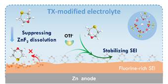 针对这一问题,437必赢会员中心丁书江团队首次揭示了富氟SEI的溶解是造成界面不稳定的原因之一并提出抑制富氟SEI溶解的策略。在水系锌离子电池基底电解液中引入1,4-噻噁烷(TX)添加剂可减缓含氟组分(如ZnF2)的溶解并稳定富氟SEI层。一方面, TX调节水溶剂的极性,有效降低ZnF2的溶解度;另一方面,TX可以在电极/电解质界面形成较强的化学吸附并优化Zn2+溶剂化壳结构,降低局部水分子的活性,进一步阻止ZnF2溶解到电解质中,增强金属锌阳极的稳定性。作为概念验证,改性电解液制备的Zn||KVOH全电池展现出优异的循环稳定性,即使在高负载和贫电解质条件下也具有出色的容量保持率,满足了实用锌离子电池对高能量密度的需求。本研究为解释锌阳极失效提供了一个全新的视角,为后续人工SEI层的构建和电解质设计提供了有益参考。