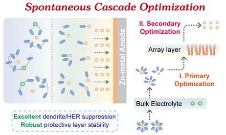 鉴于此,437必赢会员中心丁书江教授课题组首次提出自发级联优化策略。通过自由基聚合在锌负极上构建了可自发分离-重构的保护层(PAPE@Zn)。PAPE层内含有水溶性差的聚丙烯酰吗啉(PACMO)和溶解性好的聚氧化乙烯(PEO)。在电解液的诱导下,PEO可自发分离到本体电解液中与H2O相互作用,从而对锌离子的溶剂化结构实现初步调控,并且降低了PACMO层的脱溶剂化压力,从而提高了其稳定性,实现了初级优化。与此同时,溶解性差的PACMO在锌负极上重构为疏水的花状阵列结构,该阵列具有丰富的亲锌位点,可进一步促进Zn2+脱溶并有效的均匀锌离子通量,从而完成二级优化。使用 PAPE@Zn 的对称电池在1 mA cm-2下实现了4000小时的稳定循环。基于V2O5的全电池可在15 A g-1的高电流密度下实现大于12000次的超长循环。在0.6的超低N/P比和高负载量(约17 mg cm-2)下可稳定循环1000次,累积容量达2.32 Ah cm-2。级联优化策略将负极保护拆分为两个目标,通过逐步优化实现了锌离子电池性能的全面提升,为锌负极保护层的结构设计提供了新的见解,同时也有望应用于其他金属电池的研究。