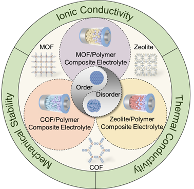 鉴于此,437必赢会员中心郗凯教授和冯国栋教授等人分析总结了具有有序微孔结构的无机功能材料(OMMs)微纳结构有序度对复合固态电解质性能的影响规律并阐明其内在机制。通过从离子传导特性、热传导性能和机械稳定性三个角度对OMMs类材料进行分析,研究团队致力于寻找适用于复合固态电解质的性能优化策略,并提出了不同OMMs所面临的挑战及潜在解决方案。这些研究分析不仅为获取高性能复合固态电解质提供了可靠的设计方案,还为OMMs在未来先进技术节点上的应用提供了可能性。此工作以“聚合物电解质中的微孔材料:论有序性的优势”(Microporous Materials in Polymer Electrolytes: The Merit of Order)为题发表在《先进材料》(Advanced Materials)上。徐明副教授和硕士研究生李丹阳是本文的共同第一作者。