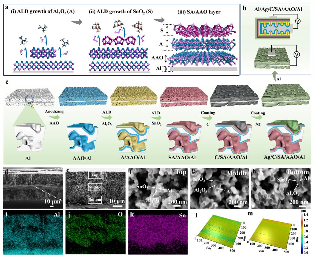 图1. AAO/Al表面上,阴极SnO2 (S)和缓冲层Al2O3 (A)的制备工艺及形貌表征