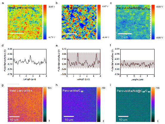 图2具有Nd@C82-PMMA耦合层的钙钛矿薄膜的电学和光学性质。(a-c)钙钛矿薄膜、钙钛矿/C60薄膜和钙钛矿/Nd@C82/C60薄膜的表面电势图;(d-f)钙钛矿薄膜、钙钛矿/C60薄膜和钙钛矿/Nd@C82/C60薄膜的表面电势变化;(g-i)钙钛矿薄膜、钙钛矿/C60薄膜和钙钛矿/Nd@C82/C60薄膜的光致发光扫描成像图。