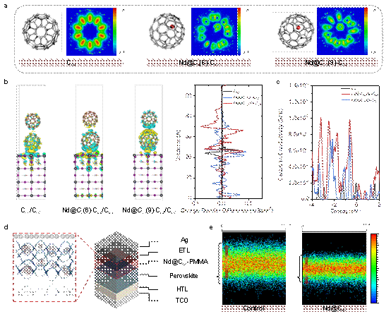 本研究利用Nd@C₂ᵥ(9)-C₈₂中Nd离子在碳笼内的动态行为及其与碳笼强烈的相互作用,实现了超快分子内电子转移;同时,Nd@C₂ᵥ(9)-C₈₂界面所产生的永久强电场,有效削弱了PMMA的电子屏蔽效应,显著提高了钙钛矿太阳能电池的载流子分离效率与光电转换性能。本研究突破了传统富勒烯在电子传输中的性能瓶颈,为新型电子传输材料的设计和应用提供了全新思路。