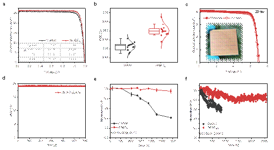 图4基于Nd@C82制备器件的光伏性能。(a)最优对照组和基于Nd@C82制备器件的J-V曲线;(b)从J-V曲线中获得的光电转换效率值的统计数据;(c)基于Nd@C82制备的最优模组的J-V曲线;(d)最优模组的最大功率点输出曲线;(e)基于ISOS-D-2I测试协议下器件的稳定性;(f)基于ISOS-L-3测试协议下器件的稳定性。
