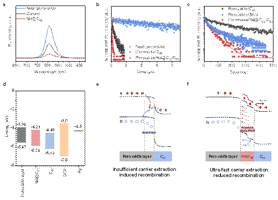 图3 Nd@C82-PMMA耦合层用于平衡电荷载流子传输。(a)钙钛矿薄膜、对照组薄膜(钙钛矿/C60)和Nd@C82薄膜(钙钛矿/Nd@C82/C60)的光致发光光谱图;(b)钙钛矿薄膜、对照组薄膜(钙钛矿/C60)和Nd@C82薄膜(钙钛矿/Nd@C82/C60)的时间分辨荧光光谱图;(c)钙钛矿/C60薄膜、钙钛矿/自组装单层(SAM)薄膜、钙钛矿/Nd@C82/C60薄膜的时间分辨荧光光谱图;(d)钙钛矿和电子传输层之间的能带排列;(e-f)能带排列示意图。