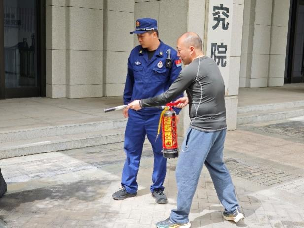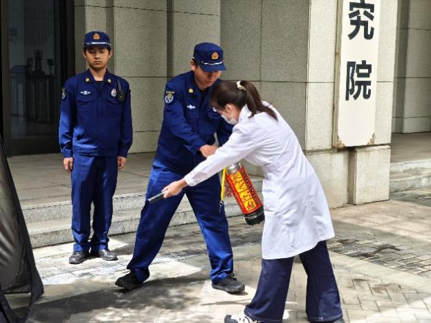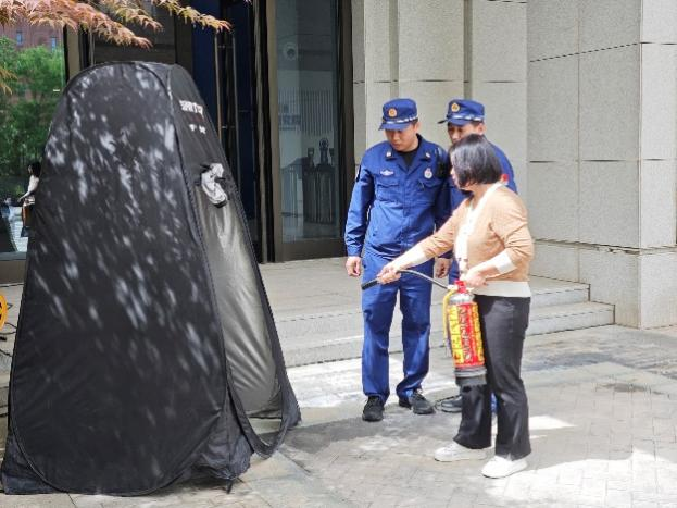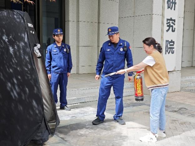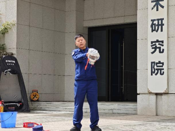疏散环节结束后,安全总指挥对演练全程进行复盘点评,充分肯定师生反应迅速、撤离有序的表现,并指出需进一步优化的细节。随后,保卫处消防专员现场演示灭火器操作口诀——“提(灭火器)、拔(保险销)、握(喷管)、压(压把)”,强调“对准火源根部持续喷射”的关键要领。针对实验室环境特殊性,消防员还重点讲解了防烟面罩的快速佩戴方法及过滤原理,提醒师生“遇浓烟时优先防烟,确保呼吸安全后再科学逃生”。