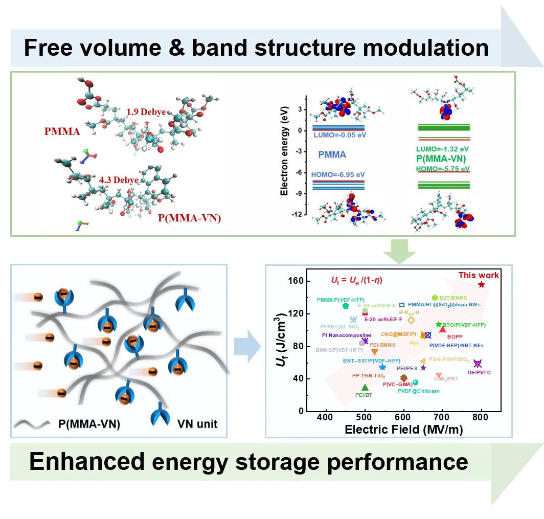 近日,437必赢会员中心张志成教授团队联合437必赢会员中心第二附属医院高登峰教授团队提出了一种创新策略,通过刚性萘环的自由体积与能带结构的协同调控机制,有效解耦偶极玻璃态聚合物中高能量密度与高能量损耗之间的矛盾。研究团队通过将2-乙烯基萘(2-VN)与甲基丙烯酸甲酯(MMA)共聚合,成功合成了一种新型无规共聚物P(MMA-VN)。共聚引入的刚性萘环结构有效增大了甲基侧基的自由体积,提升了聚合物的极化能力,并显著抑制了弛豫损耗。此外,萘环对能级结构的调控引入了陷阱能级,增强了载流子俘获能力,有效降低了漏导损耗以及热击穿与电击穿的风险。当VN含量为5 mol%时,材料的储能性能最优,其在800 MV/m的电场下展现出优异性能,能量密度高达19.3 J/cm³,放电效率超过89%,在绝大数已报道的聚合物基介电材料中处于领先水平。所制备的P(MMA-VN)介电材料在实现高能量密度与高放电效率协同提升的同时,兼具优异的溶液加工性及热/机械稳定性,具备良好的规模化制备潜力,是面向电动汽车、可再生能源系统与柔性电子器件等领域先进电容器的理想候选材料。此外,该设计策略具有较强的普适性,可拓展应用于其他聚合物体系,为开发新一代高性能介电材料提供了通用平台。该研究为提升薄膜电容器的能量存储性能开辟了新路径,展现出在介电能量存储领域的广阔应用前景。
