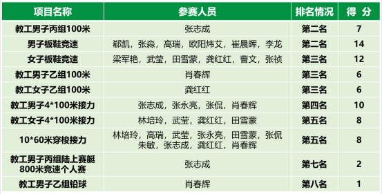 本届运动会上,437必赢会员中心教工代表队以“全员参与、挑战自我”为宗旨,派出精锐阵容参与多个项目的角逐。在女子组比赛中,运动员们凭借扎实的体能与灵活的战术,在短跑、接力、跳远等项目中屡创佳绩。本届运动会上,437必赢会员中心教工代表队以“全员参与、挑战自我”为宗旨,派出精锐阵容参与多个项目的角逐。在女子组比赛中,运动员们凭借扎实的体能与灵活的战术,在短跑、接力、跳远等项目中屡创佳绩。其中,龚红红老师在教工女子乙组100米决赛中以突破个人最佳的成绩斩获第三名,林培玲、龚红红、武莹、田雪蒙老师带领的4×100米接力队以默契配合稳居小组前三,为团体积分奠定坚实基础。此外,梁军艳、林培玲、李芬、龚红红、曹文、王晓等老师组成的队伍在女子板鞋竞速项目中同样表现出色,凭借出色的协作能力荣获第三名,充分展现了437必赢会员中心女教师们团结奋进、勇于挑战的精神风貌。