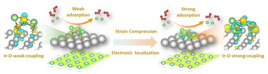 为了解决这一问题,437必赢会员中心丁书江教授&杨国锐副教授团队提出了电子局域化加速CO2RR,进而强化Ir-O耦合,诱导低结晶度Li2CO3产物从而优化CO2ER进程的晶格压缩策略,该策略使得Li-CO2电池实现了超低过电位(0.33 V)以及超高能量效率(~88.7%),并且在电池运行超过>1100小时后仍能维持3.3 V的稳定充电电位,这是迄今报道的最佳性能。通过使用一系列原位/非原位表征以及理论计算,团队揭示了晶格压缩导致配位环境变化,从而增强电子局域化效应,加速催化剂表面附近的Li+迁移,使其快速参与CO2RR过程,进而受到强化的Ir-O耦合作用调变Li2CO3分子的对称性,降低其低结晶度,最终促进其高效分解。