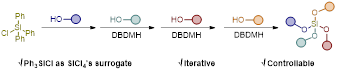 针对上述问题,437必赢会员中心王优良教授团队首次实现了四种不同醇分子在单个硅中心原子上的逐步可控连接,成功制备了传统方法难以合成的含四种不同烷氧基的硅烷。研究团队创新性选用三苯基氯硅烷(Ph₃SiCl)作为四氯硅烷的合成等价体,以脱苯基醚化反应为关键反应,实现了亲电性卤化试剂对硅-苯键的精准切割与醇分子的可控连接。
