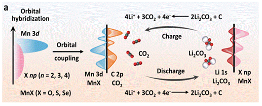 针对上述难题,437必赢会员中心何雅玲院士、郗凯教授团队,携手吉林大学徐吉静教授,提出了一种基于d-p轨道杂化调控的新型催化设计策略。通过调控过渡金属与硫族元素间的电子耦合,显著优化Li-CO₂电池氧化还原反应动力学。研究以锰基硫族化物(MnX, X=O, S, Se)为模型体系,结合密度泛函理论(DFT)计算与实验验证,系统揭示了阴离子化学对电子结构及催化性能的影响规律。结果发现,Mn与S之间的d-p轨道杂化作用最强,可有效提升金属中心电子密度,降低CO₂活化与Li₂CO₃分解能垒,从而显著加速反应动力学。这种催化策略使Li–CO₂电池在100 mA·g⁻¹电流密度下实现了高达19782 mAh·g⁻¹的优异放电容量,并在500 mA·g⁻¹条件下展现出超过430圈的出色循环稳定性。这项研究不仅提出了基于d-p轨道杂化调控的催化策略,有效加速了Li-CO₂电池中CO₂和Li₂CO₃的氧化还原反应动力学,也为其他金属–二氧化碳电池的催化材料设计提供了重要思路。研究成果以“通过d–p轨道杂化调控提升Li–CO₂电池氧化还原反应动力学”(d-p Orbital Hybridization Tailoring for Boosted Redox Kinetics in Li-CO₂ Batteries)为题发表于《先进功能材料》(Advanced Funtional Materials)上。