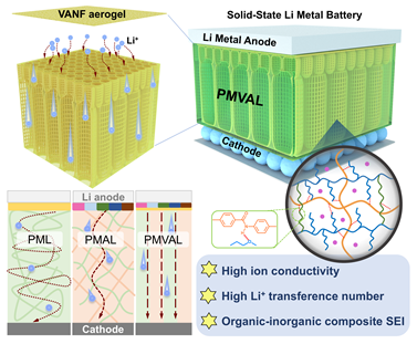 近日,437必赢会员中心高国新副教授团队成功攻克这一难题,提出“多层级孔道纳米芳纶支撑双交联聚合物网络”的创新策略。团队通过小分子单体共聚,构建出以短醚链为侧链的聚合物网络,从根本上打破了醚类聚合物在室温下易结晶的行业困境;同时,借助氢键自组装技术,打造出具有多层级孔道的芳纶纳米纤维气凝胶——该特殊结构不仅能有效锚定阴离子基团、抑制电池极化,还能为Li⁺开辟连续且快速的传输通道。两种聚合物网络通过三维互穿实现功能协同,最终研发出的固态电解质,室温离子电导率成功达到10⁻⁴ S cm⁻¹的关键技术指标。更值得关注的是,这种创新结构还促使锂金属与电解质界面形成“富有机-富无机双层固态电解质界面膜(SEI膜)”,在提升界面兼容性的同时,实现了锂的均匀沉积与剥离,从根源上规避了锂枝晶生长带来的安全隐患。基于该电解质组装的全电池,在室温环境下成功实现超1000次充放电稳定循环,性能表现达到行业先进水平。此项技术突破不仅为固态聚合物电解质的结构设计与性能优化提供了全新思路,更将为我国高安全锂金属电池的产业化发展注入强劲动力,推动新能源储能领域技术革新。