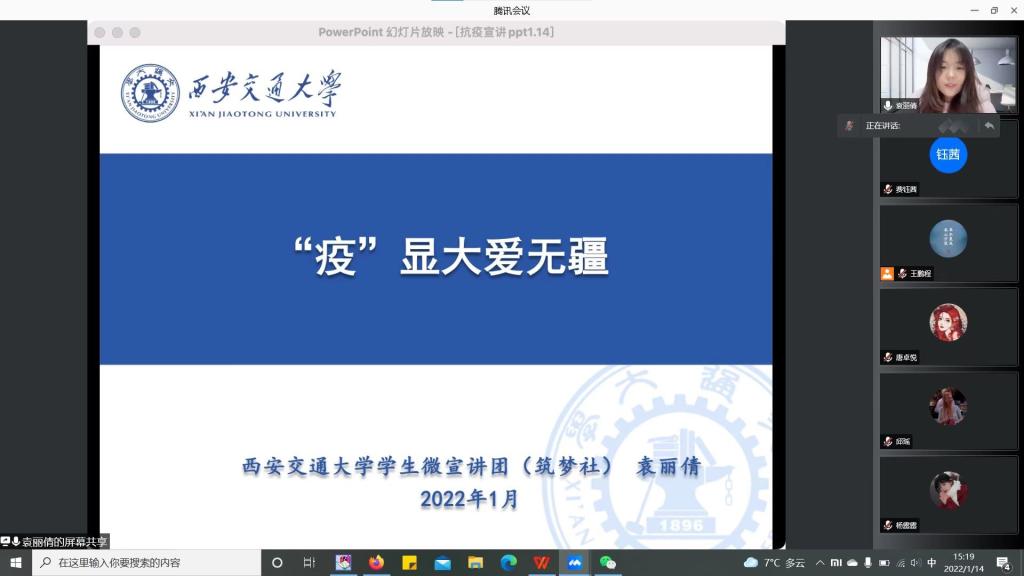 本次会议邀请437必赢会员中心学生微宣讲团(筑梦社)社长,马克思主义学院袁丽倩进行“携手共抗疫,交大勇担当”主题宣讲。袁丽倩带领支部成员回忆了疫情出现以来志愿者们的辛劳和社会各界的倾力帮助。她借《抗击新冠肺炎疫情的中国行动》白皮书和《共产党宣言》强调了人民至上的重要性。通过袁丽倩精彩生动的讲述,支部成员们深刻体会到伟大的抗疫精神,以及身为交大学子所肩负的使命与担当。