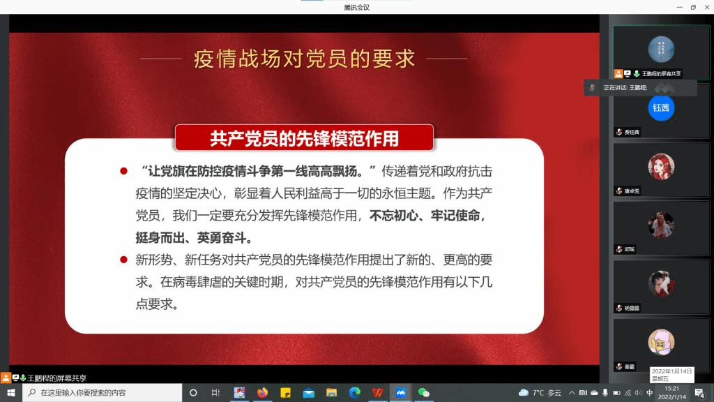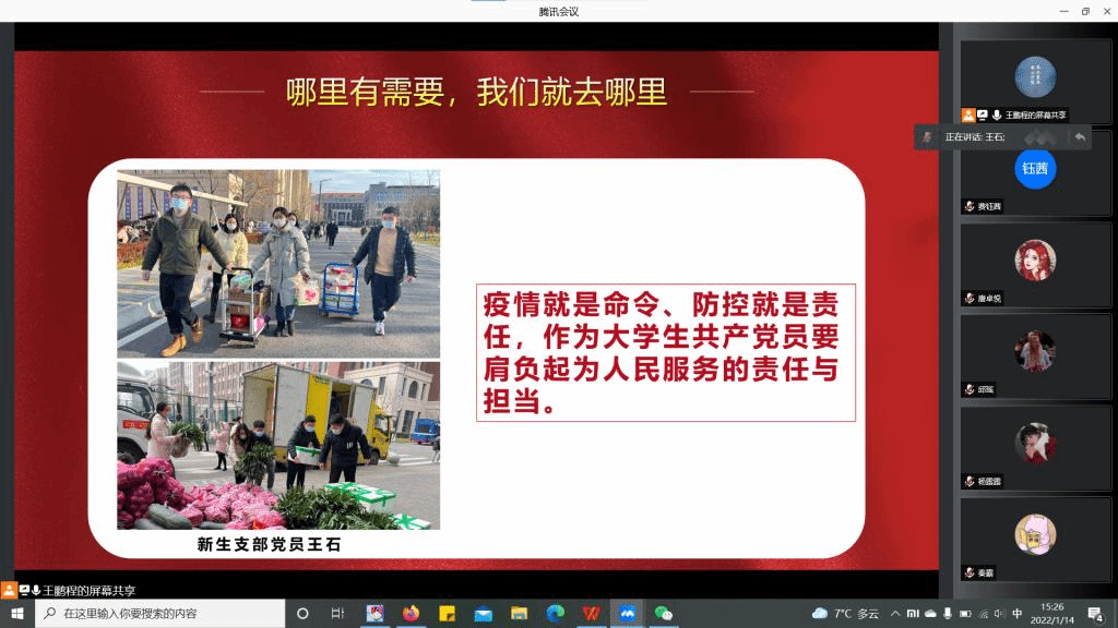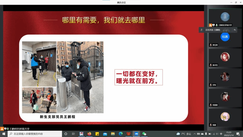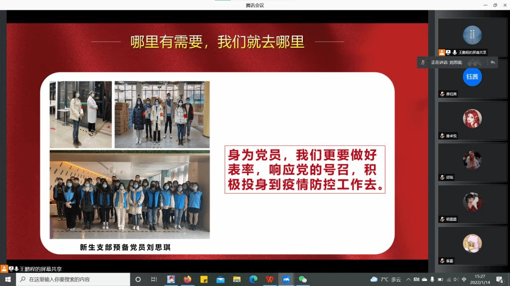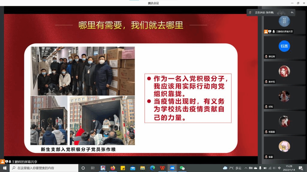 为更好把握伟大抗疫精神,凝聚磅礴奋进力量,争做西迁精神新传人,2022年1月14日下午,437必赢会员中心新生党支部在线上召开2022年第一次党员大会。会议由支部书记王鹏程主持,支部全体党员以及入党积极分子参加,437必赢会员中心辅导员唐卓悦列席会议。