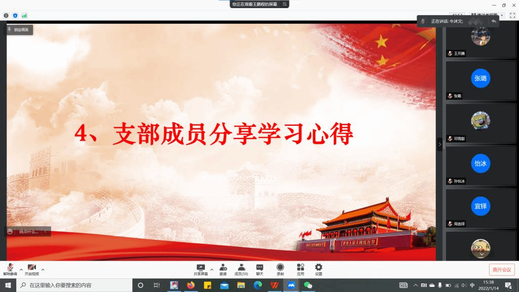 会议第四项,由支部成员分享学习心得。罗美廷说,学院学校设身处地为学生着想、努力为学生解决困难,给同学们带来了极大的安全感;闻学说,面对疫情,我们要约束好自己的行为,也要努力为疫情防控贡献出一份力量。