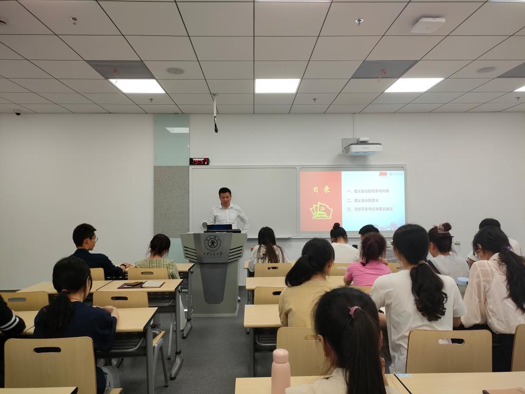 最后,团委副书记石杨根以《伟大的转折——遵义会议》为题向同学们讲授了一场生动鲜活的党史学习教育主题党课。课程详细讲述了遵义会议的背景、内容、意义,从各方面论证了为何遵义会议是伟大的转折点。在课程讲授中,石杨根通过形式多样的课堂互动提高了学生的参与感,通过分享自己参观遵义会议旧址的体会,拉近了和学生之间的距离感。在课程结束时,石杨根表示,学历史不能只看历史的大框架,要去深挖里边所蕴含的精神。