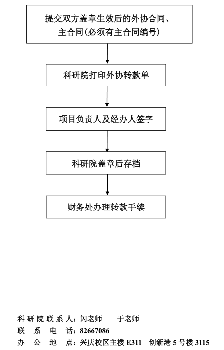 财务处办理转款手续,在财务系统打印报销单,报销内容选择外协费,并附合同以及转款单