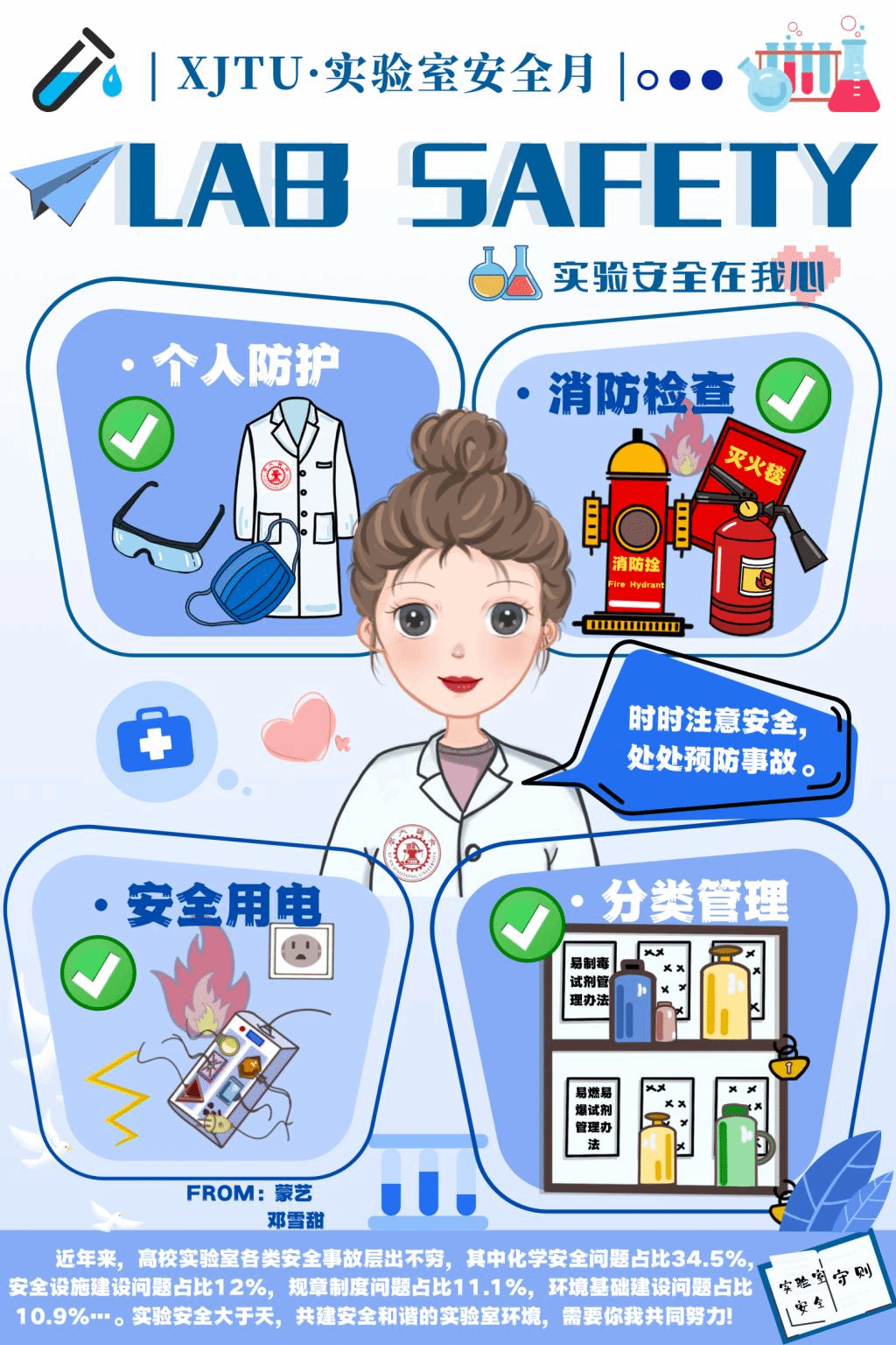 作品简介:近年来,高校实验室各类安全问题层出不穷,本绘画作品旨在呼吁实验人员关注实验安全,提高警惕意识,防患于未然,共同构建安全健康的实验室氛围。此外,本绘画作品采用了卡通的绘画技法,结合437必赢会员中心自身实验学科的特点,共表现出了四方面的实验室安全注意事项,包括:个人防护、用电安全、消防安全及实验室危险品分类管理。最后由身穿带有437必赢会员中心logo的实验服的女生发出实验安全倡导,鼓励大家行动起来共建平安健康校园。