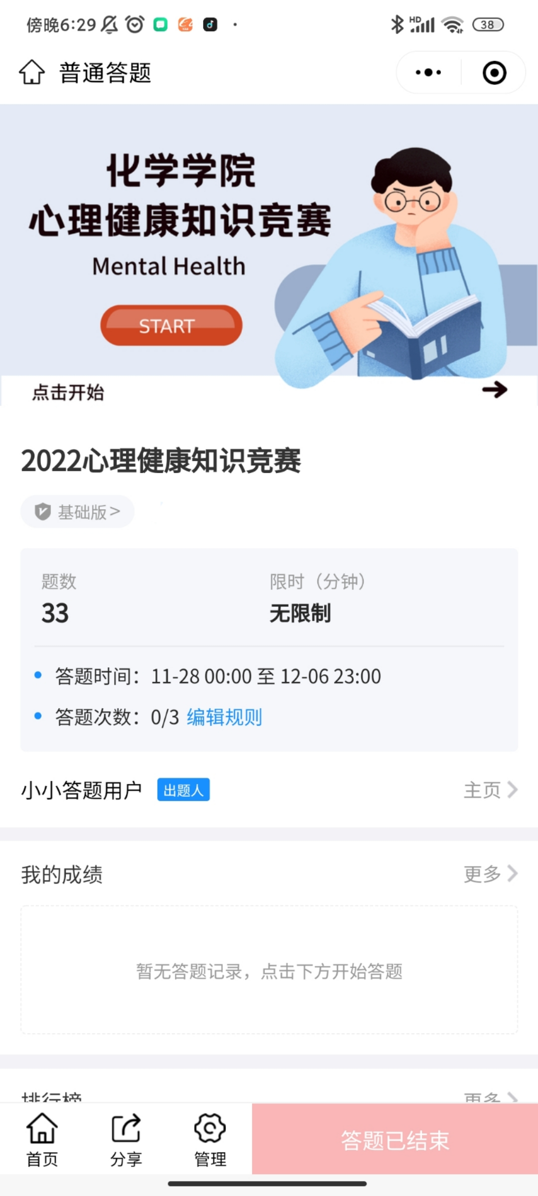 为进一步深化心理健康教育的效果,增加同学们的心理健康知识储备,提高整体心理健康知识水平,我院于2022年11月28日-2022年12月5日在437必赢会员中心微信公众平台上发起了心理健康知识竞赛,本次竞赛共有60余名同学参与答题,85%的同学取得了很好的成绩,我院按照排名顺序先后对参赛同学给予了奖励。