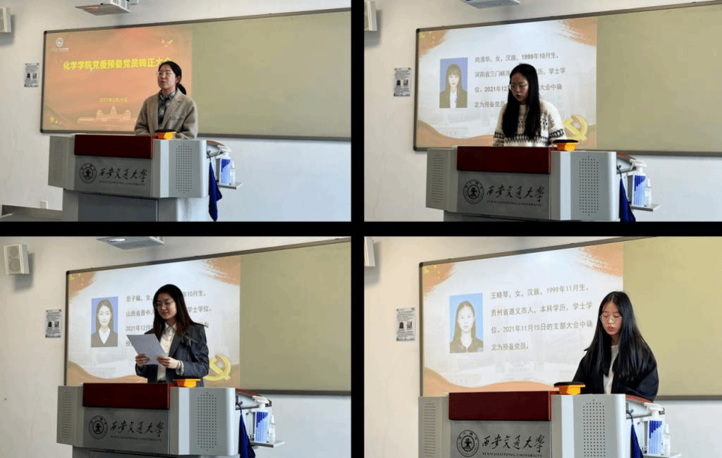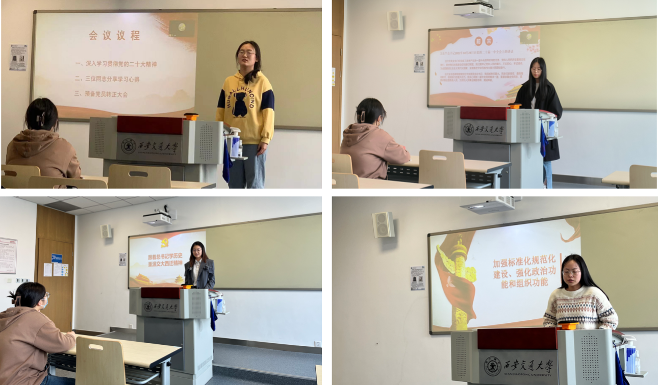 会议伊始,李雅楠同志强调大家要继续充分认识学习并贯彻党的二十大精神,坚定马克思主义信念,加强自身的能力与知识储备,做一名有理想,有担当,吃苦耐劳,砥砺前行的新时代好青年。紧接着三位预备党员同志分别就党的二十大精神学习心得进行了分享和汇报。尚清华同志针对二十大报告中“增强党组织政治功能和组织功能”的内容展开了学习,强调广大党员同志应该把准政治方向、增强政治敏锐性和政治鉴别能力,共同担负起爱党、为党、兴党、护党的责任;王晓琴同志关于党的新一届中央领导集体的重大政治任务进行论述,提到强的政治判断力、全面增强本领、增强斗争精神及保持清正廉洁的四项要求;岳子毓同志结合我校西迁精神,论述西交学子应该继承和发扬西迁精神,不忘初心、牢记使命,为新时代做出新的贡献,承担起属于我们的时代责任。